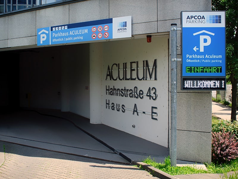 Das Aculeum in Frankfurt-Niederrad ist ein großer Gebäudekomplex, der aus einem sechsstöckigen Haupgebäude und einem 13-stöckigen Hochhaus besteht. Er beherbergt Unternehmen verschiedenster Branchen und Bereiche. Im Parkhaus Aculeum APCOA Frankfurt können Sie direkt in diesem Büro- und Gebäudekomplex parken. Das Parkhaus stellt die Tiefgarage des Aculeums dar und bietet auf vier Parkebenen 852 Stellplätze. Durchgehend geöffnet können Sie hier am Niederrad parken und das Parkhaus als Besucher ebenso wie als Beschäftigter im Aculeum nutzen. Das Parkhaus Aculeum Frankfurt bietet die Möglichkeit des Kurzparkens sowie des Dauerparkens an: Mieten Sie einen Parkplatz zum monatlichen Festpreis und nutzen Sie das Parkhaus so oft und lange Sie möchten. Ideal ist ein Dauerparkplatz für Anwohner und Beschäftigte, die regelmäßig auf einen Parkplatz vor Ort angewiesen sind. Sie finden das Parkhaus Aculeum Frankfurt in der Hahnstraße in Frankfurt-Niederrad, direkt im gleichnamigen Gebäudekomplex.