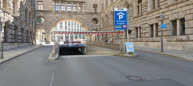 Das Parkhaus „Petersbogen“ mit Zugang zum Kino, Einkaufszentrum, Stadthaus, Fußgängerzone und Innenstadt. Dauerparken möglich.